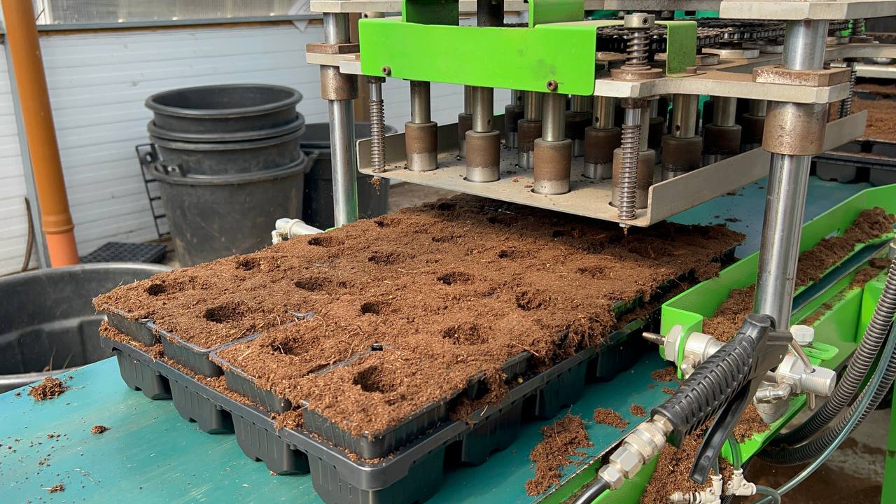 2⃣ Затем они наполняются торфом. Для этого используется универсальная торфонаполнительная машина.